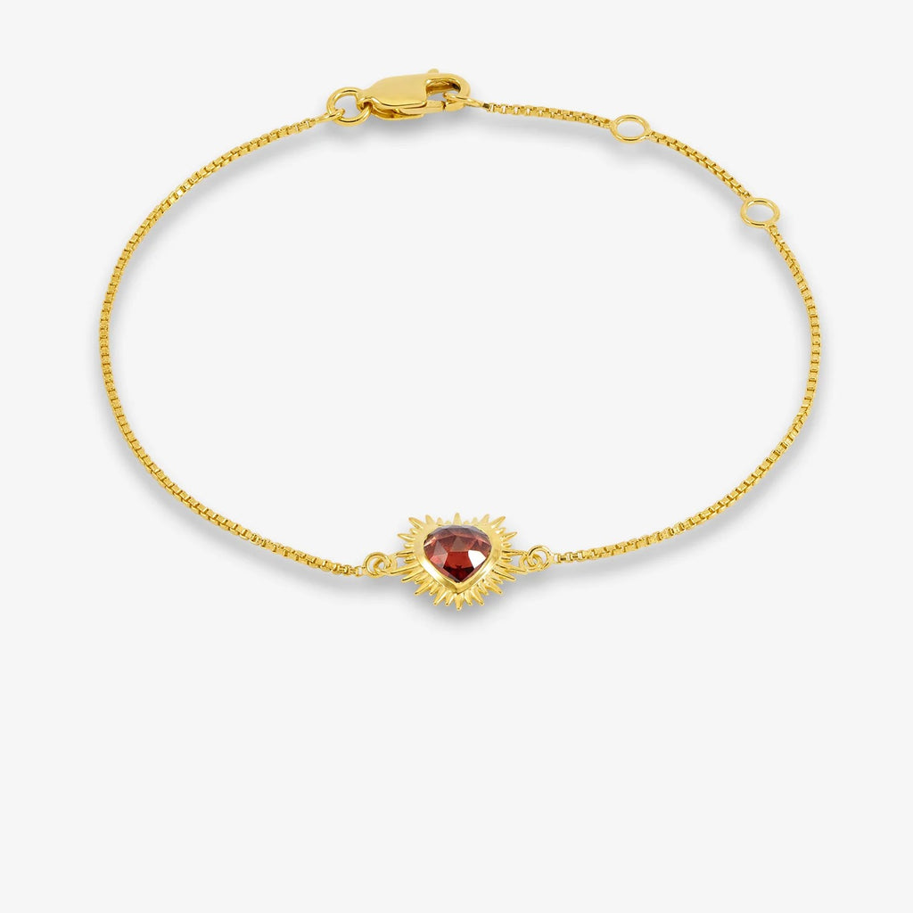 Rachel Jackson Electric Love Garnet Heart bracelet. A Higher Love. This iconic Art Deco heart motif with a hand-carved, rouge noir Garnet stone and signature electric rays exudes an empowering aura and is integrated into a luxe, adjustable-length box chain. Garnet is also the birthstone for January and is said to bring the wearer courage, energy and love