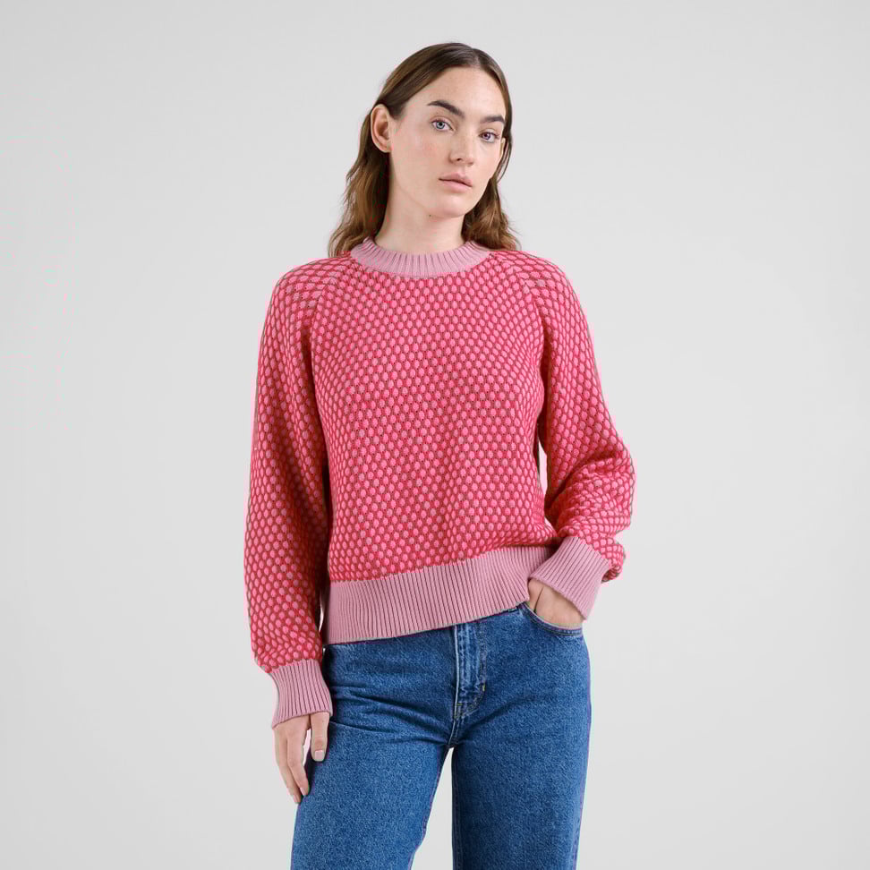 Husie Bubble Knit True Red & Lilas Pink Sweater from Dedicated. A loose-fit sweater with a bubble knit structure. Raglan sleeves with ribbed endings and bottom hem.