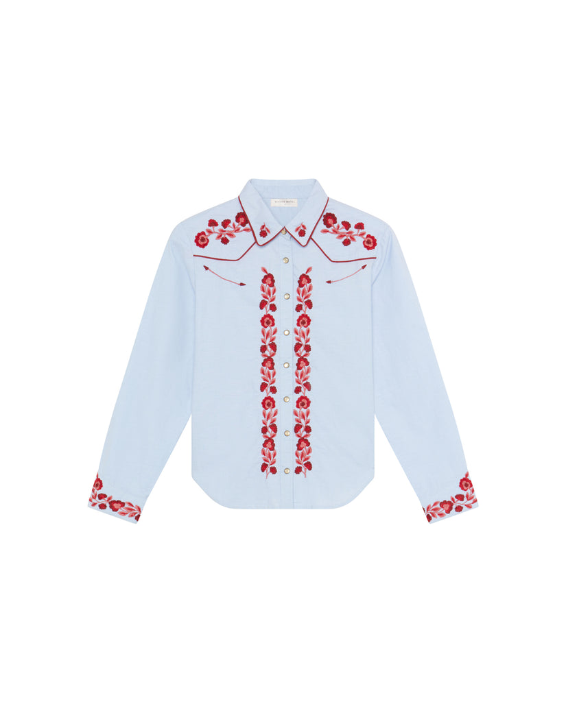 Striking red floral embroidery covers the chest, cuffs and button placket, while snap buttons underline its Western reference. The contrast feels bold yet crafted.