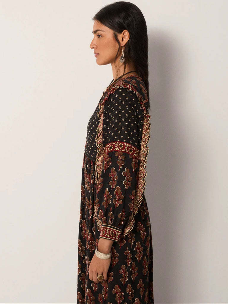 Lily Cocora Dress is cut in lightweight viscose dobby, the Lily Dress is where ease meets intricacy. Its flowing silhouette is fully adorned with prints that play across the dark ground, giving it movement, depth, and an unmistakable bohemian edge.