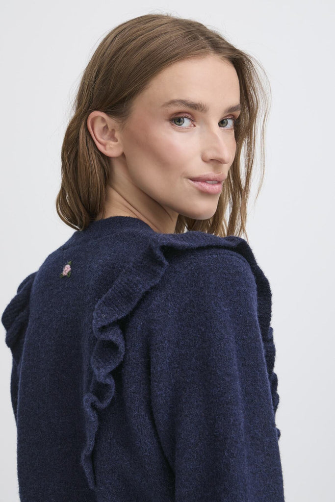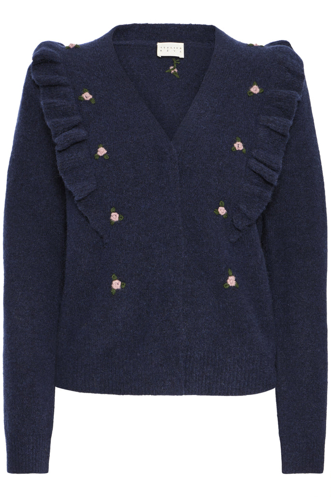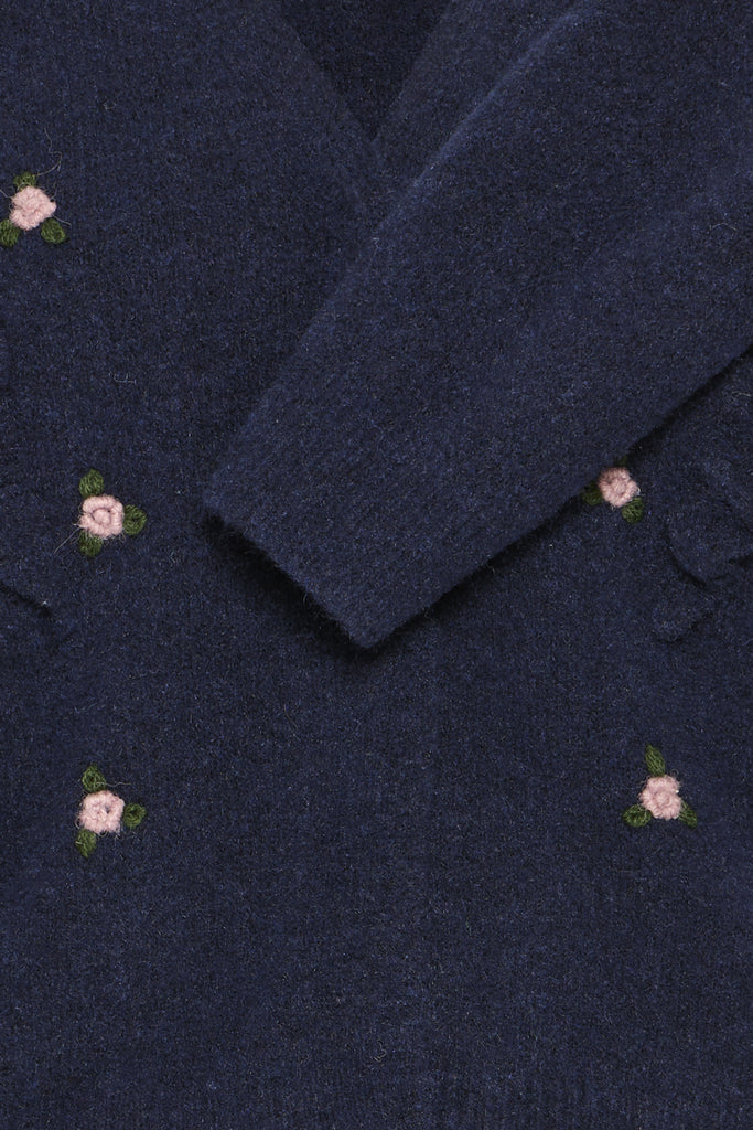 Morris Maritime Blue cardigan from Atelier Rêve. A deep blue knit cardigan featuring small pink flowers and snap button closure along with a ruffle shoulder.