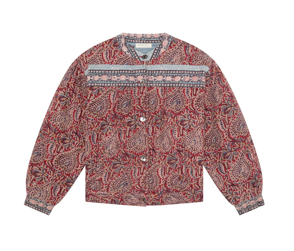 Olivia Johnny Walker Jacket is a boxy, button-up jacket cut from jacquard cotton canvas, saturated in deep burgundy, sand and indigo tones. The paisley pattern unfolds like a woven tapestry, intricate yet relaxed in feel. Lightly padded for structure, it balances warmth with ease.
