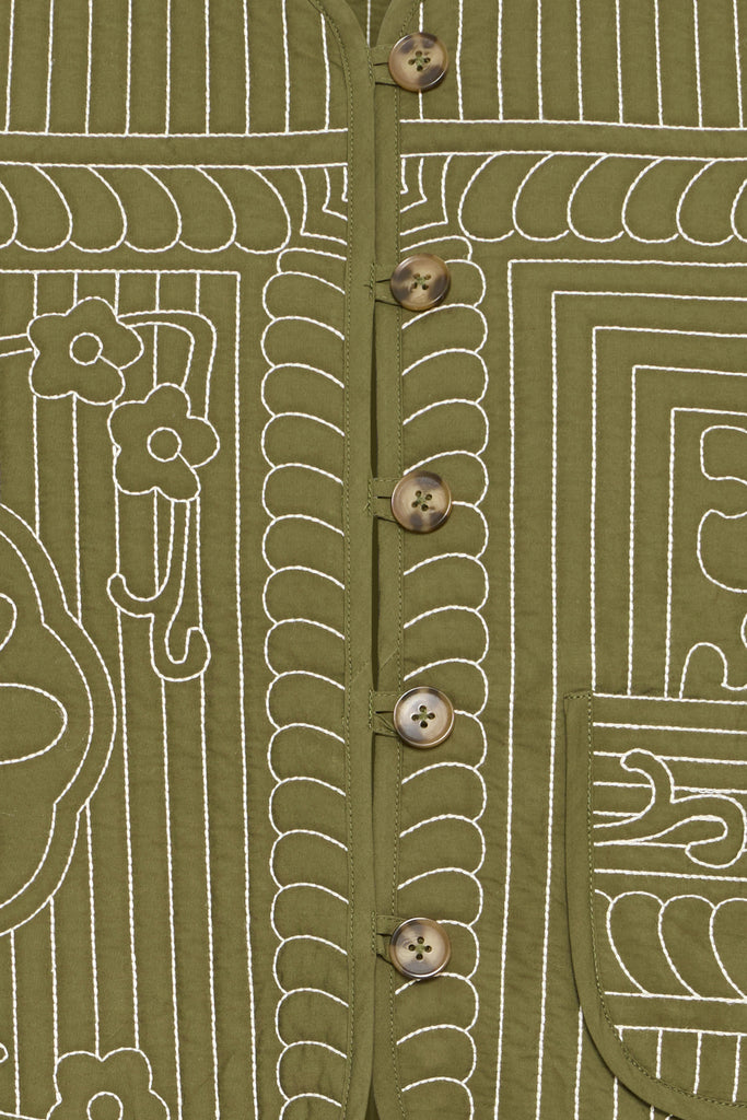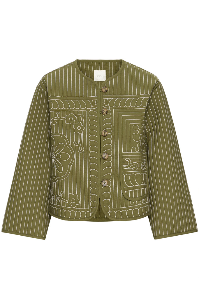 The Quinna Jacket from Atelier Reve. A 100% cotton jacket with embroidery detail for a quilted look. This jacket is a perfect addition to your spring wardrobe. Pair it with the Leono trousers for the complete look.