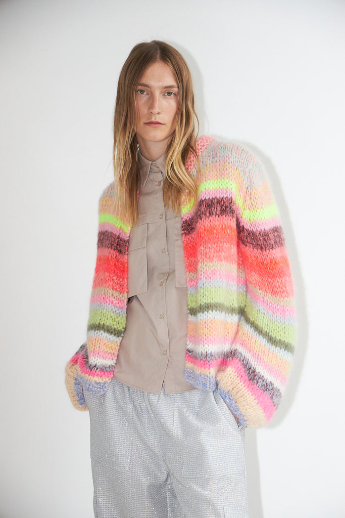 New for Spring/Summer 25 is the Gabi mohair Bold Multi-stripe cardigan from Dawn x Dare. This cardigan is knitted by hand by Italian women working from their homes in the hilly villages near San Giovanni delle Contee, Tuscany. Therefore each piece is unique and sizes will vary slightly from piece to piece.