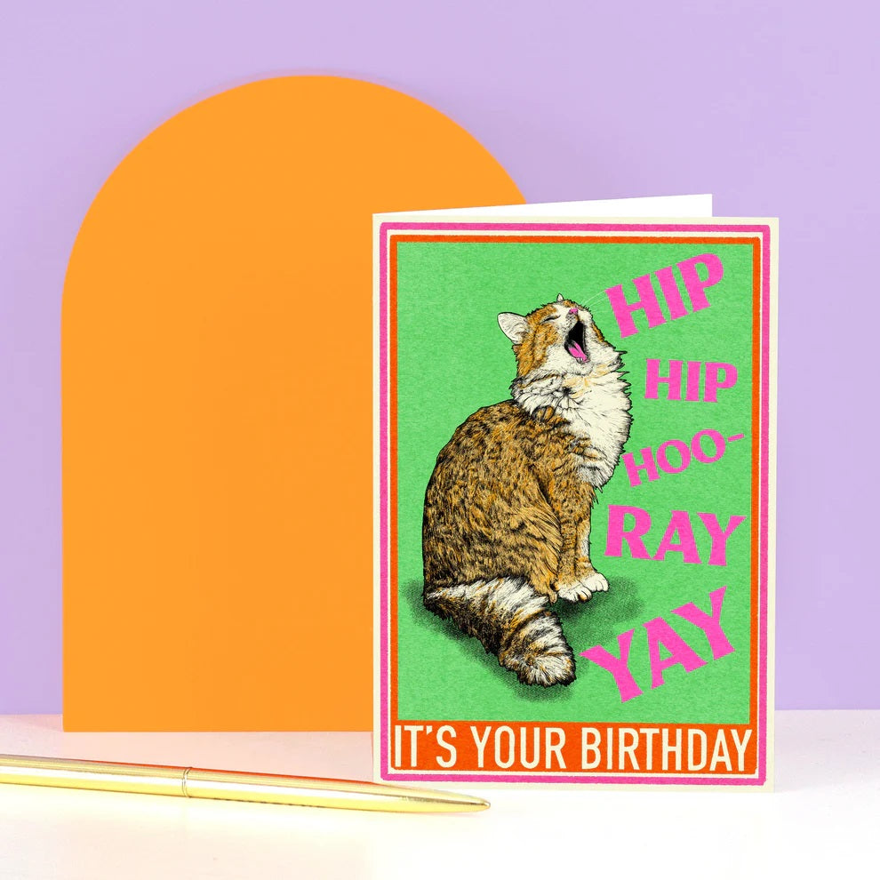 Hip Hip Hooray Cat Birthday Card features a cool cat and is a great way to say Happy Birthday! Make a cat lover’s birthday extra joyful with this adorable Hip Hip Hooray Cat Card! Featuring a cheerful tabby cat shouting “Hip Hip Hooray!”, this card is perfect for spreading smiles on birthdays of all ages.