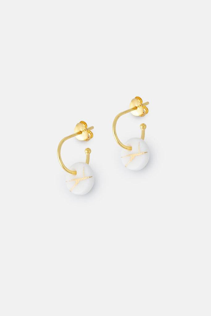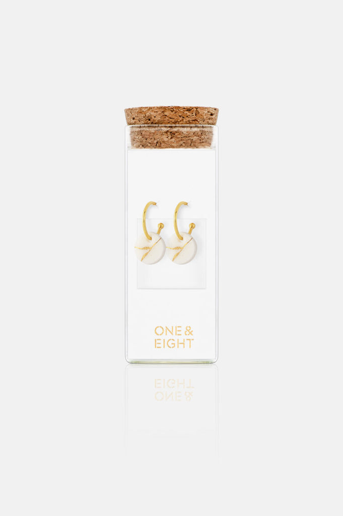 Porcelain Kintsiguri Earrings, inspired by the Japanese art of repairing broken pottery with gold, to render a new piece more beautiful than before. These handmade earrings feature a white disc with a delicate line design. Paired with our 11mm Hoop Studs, these classic earrings are beautifully packaged in a glass bottle, perfect for a gift or a treat for yourself.