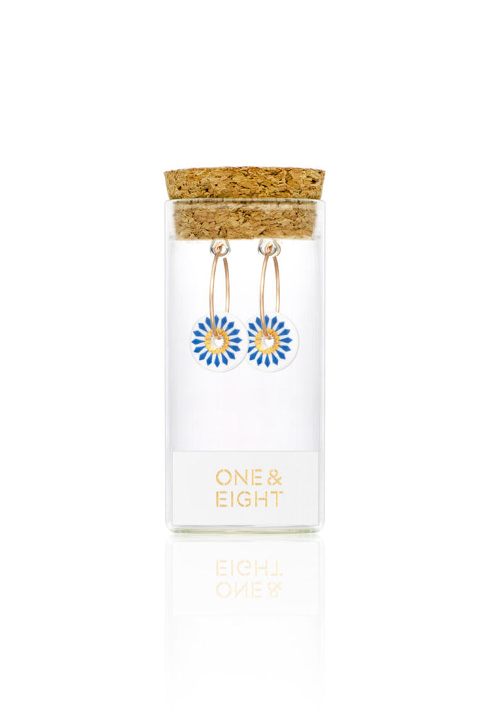 White Riley Earrings are beautifully delicate small white porcelain discs, with a blue flower motif and gold centres, threaded onto gold hoop earrings. An intricate process of colouring, shaping, firing and glazing clay is used in the making of these handcrafted porcelain discs.