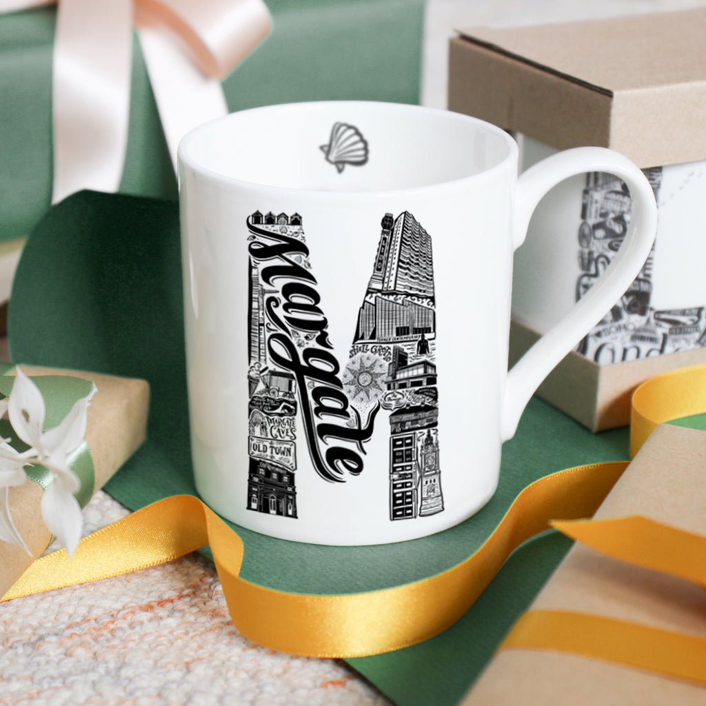 Margate Bone China Mug from LucyLovesThis. This lovingly designed artwork celebrates Margate in Kent. The M for Margate showcases this iconic coastal town, famous for Dreamland, its charming old town, and of course the incredible sandy beach.