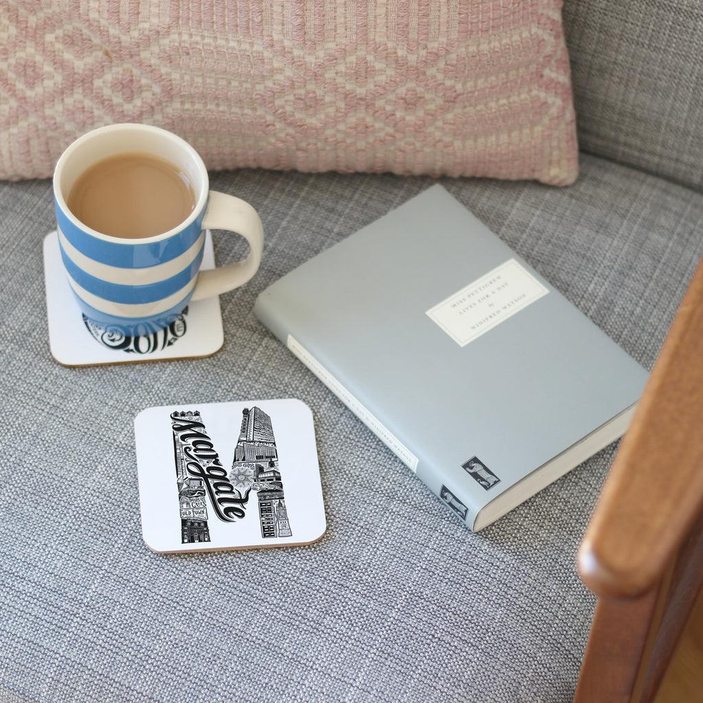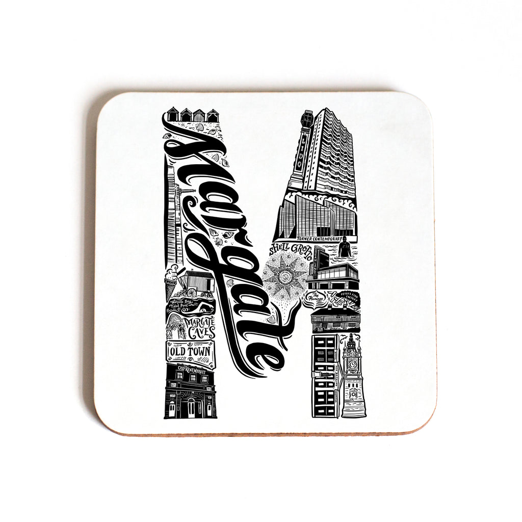 Margate Coaster from LucyLovesThis. This lovingly designed artwork celebrates Margate in Kent. The M for Margate showcases this iconic coastal town, famous for Dreamland, its charming old town, and of course the incredible sandy beach.