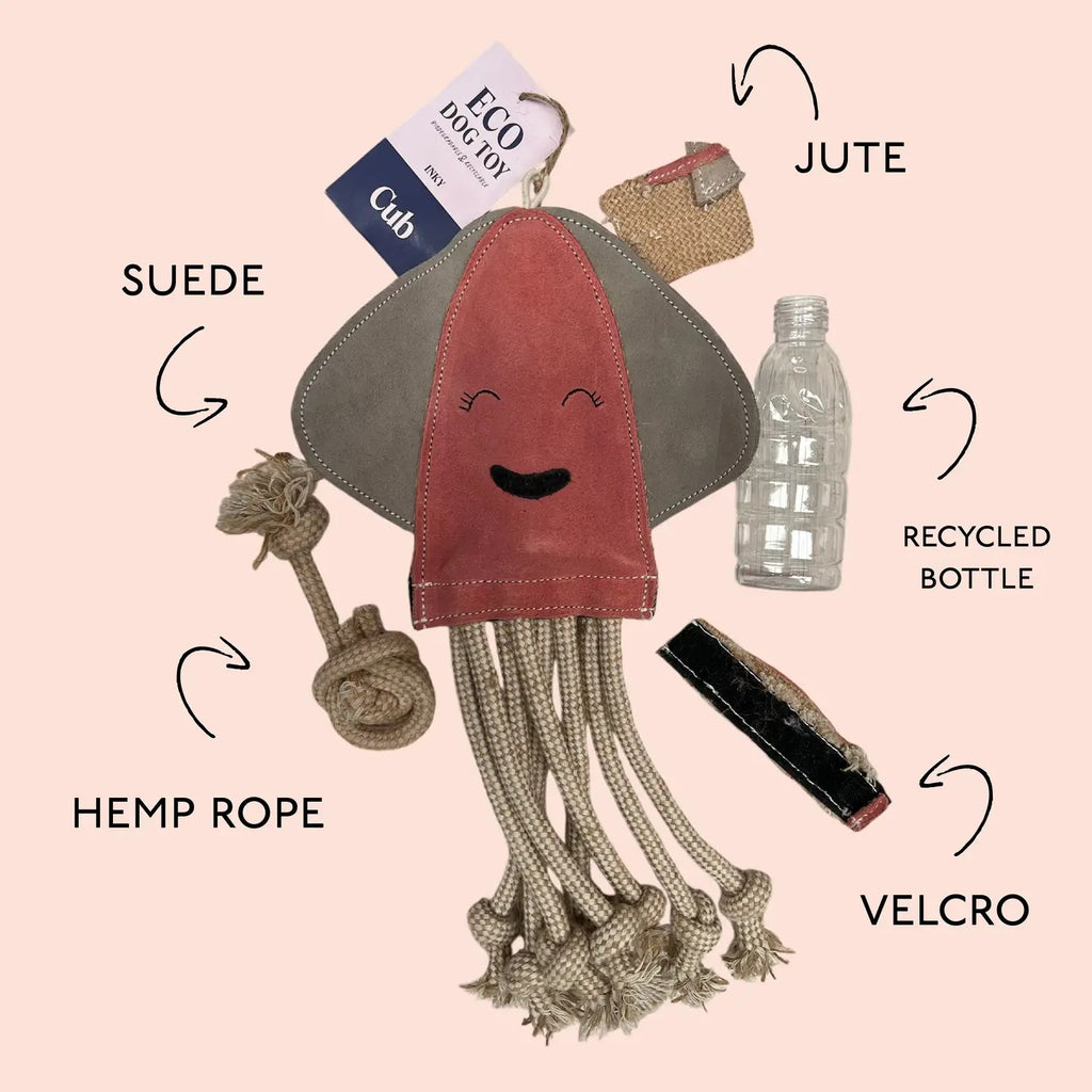 Inky Eco Leather Dog Toy from Cub comes equipped with a recycled crinkle bottle to provide that satisfying 'crunch'. Crafted from sustainable jute, a natural plant fibre, and enveloped in a gentle suede covering, this toy boasts durability without the use of any harmful compounds that might be released during chewing. Jute is completely biodegradable, and the suede serves as a valuable by-product, ensuring minimal waste in its production process.