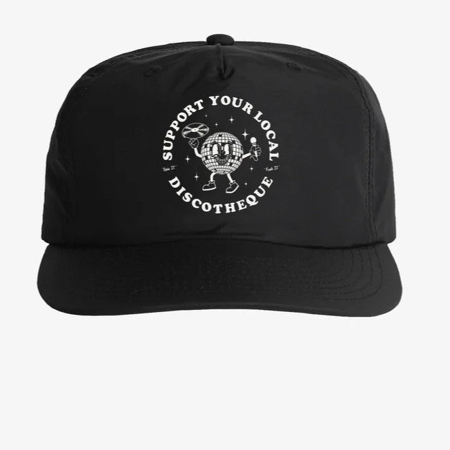 Support Your Local Discotheque 5 Panel Black Cap from Batch Goods.